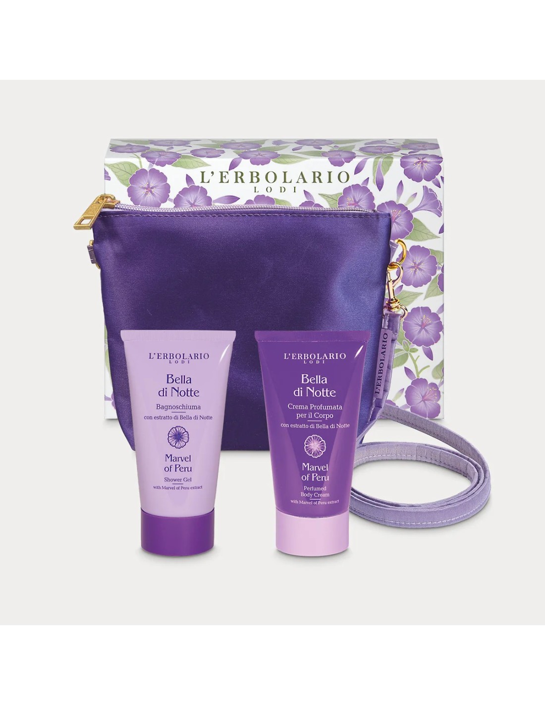POCHETTE CIN RASO CON TRACOLLA CONTENENTE UN BAGNOSCHIUMA ED UNA CREMA CORPO AL PROFUMO DI BELLA DI NOTTE, DALLE DOLCI E DELICATE NOTE FIORITE E VANIGLIATE